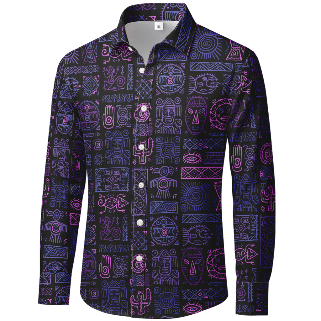 Antike trifft Moderne. Dieses langärmlige Hemd mit Knopfleiste besticht durch ein durchgehendes Muster aus tribal-inspirierten Glyphen – Masken, Sonnen, Spiralen, Hände, Kakteen und geometrische Formen – umrandet von Türkis, Orange und Sand auf tiefschwarzem Grund. Der glatte Stoff aus 100 % Polyester ist leicht, knitterarm und schnelltrocknend und eignet sich ideal für Streetwear, kreative Büros, Festivals und Reisen.