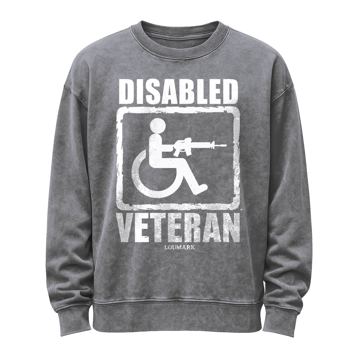 Dieser Vintage-Pullover in gewaschenem Schwarz mit Rundhalsausschnitt besticht durch eine auffällige, abgenutzte weiße Frontgrafik: ein Rollstuhlsymbol, eingerahmt von einem robusten Abzeichen mit dem übereinander gestapelten Text „DISABLED VETERAN“.