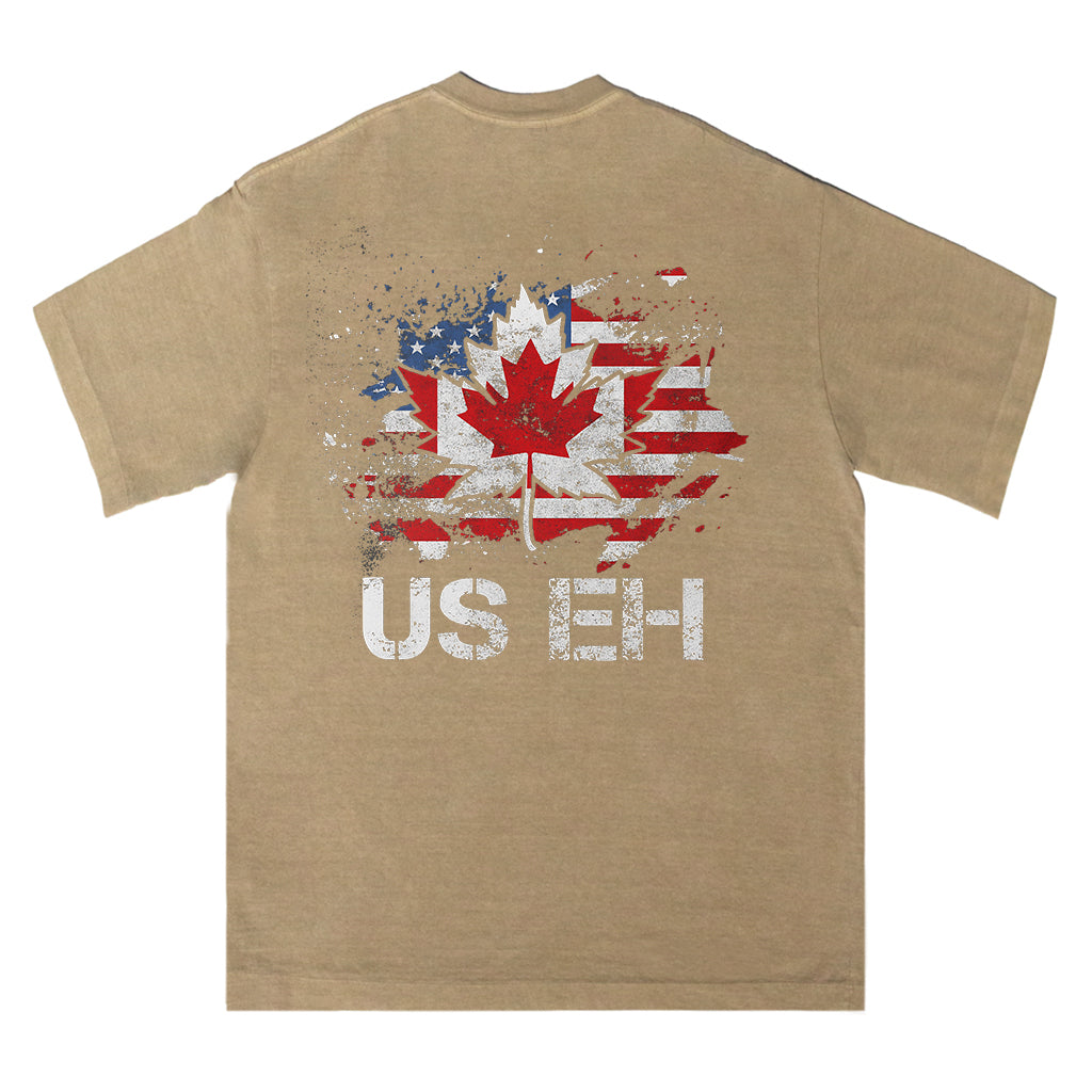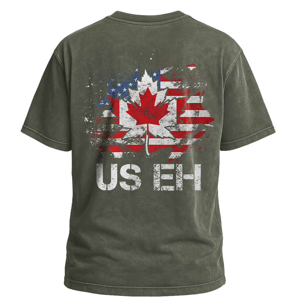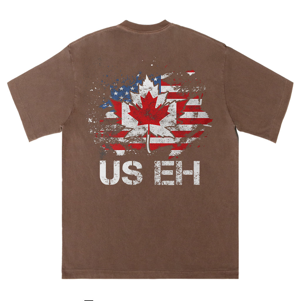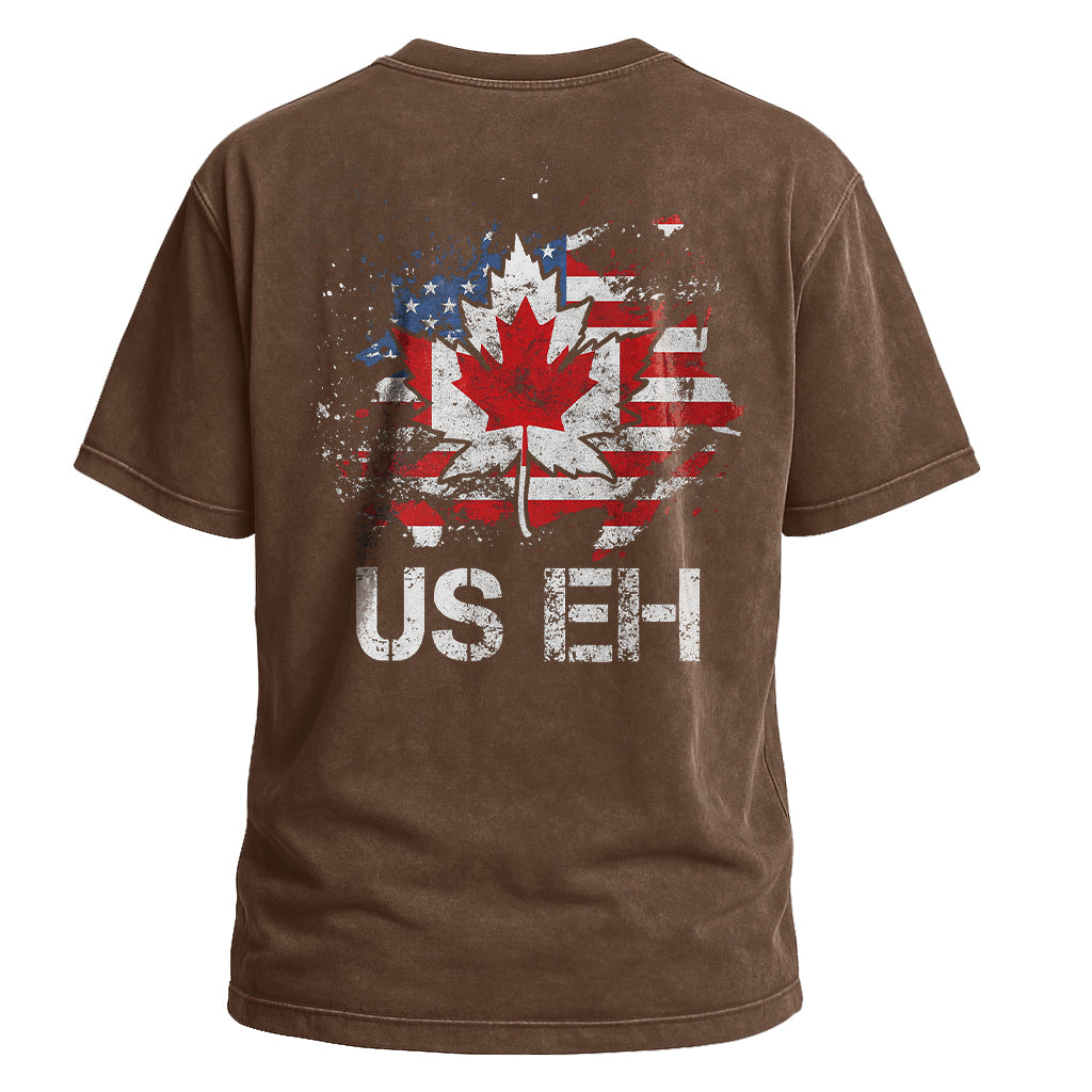 Celebrate North American friendship with LouMark’s US EH Maple Leaf Tee. This washed brown shirt features a distressed graphic combining the American and Canadian flags with a prominent red maple leaf, accompanied by the text “US EH.” Made from 100% cotton for comfortable wear with a vintage, rugged look.
