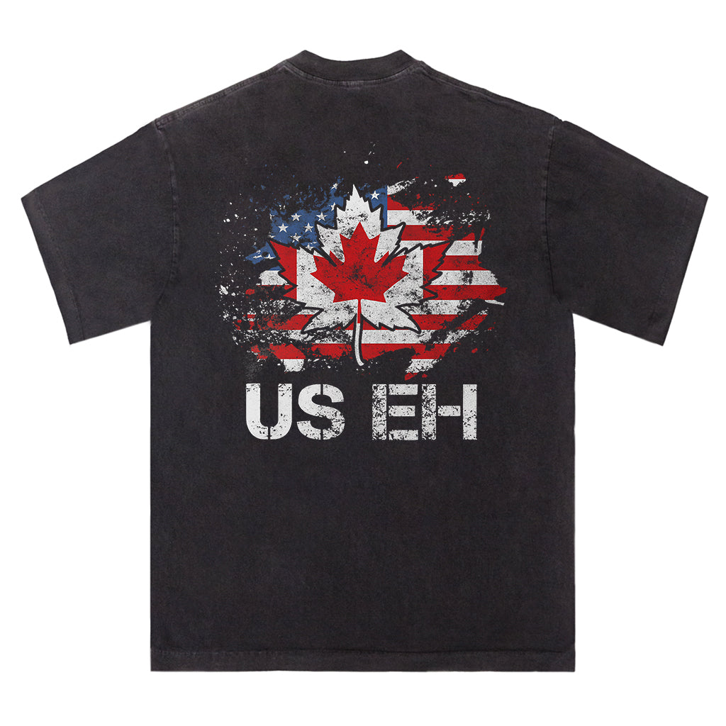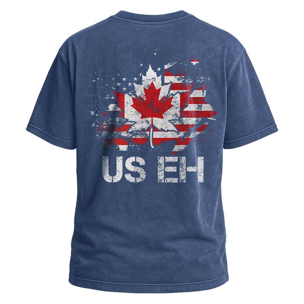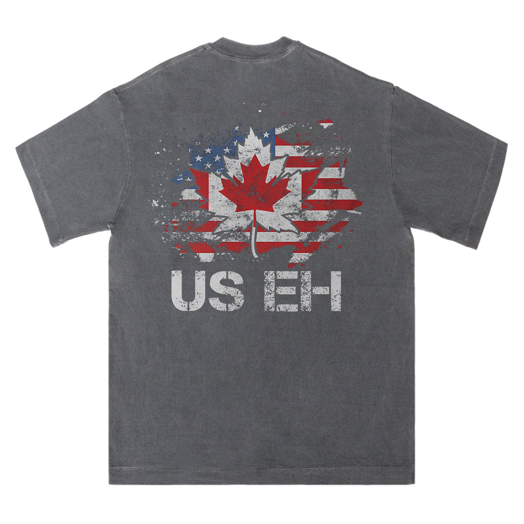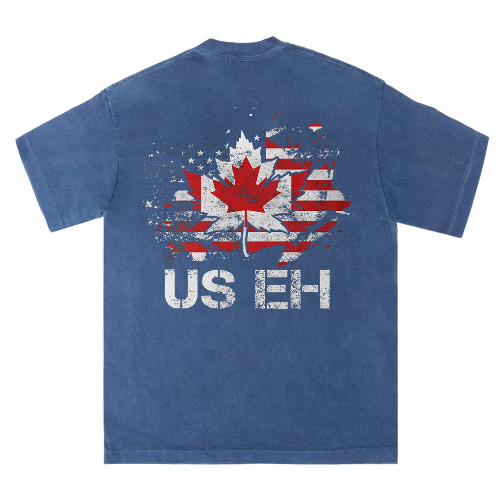 Celebrate North American friendship with LouMark’s US EH Maple Leaf Tee. This washed brown shirt features a distressed graphic combining the American and Canadian flags with a prominent red maple leaf, accompanied by the text “US EH.” Made from 100% cotton for comfortable wear with a vintage, rugged look.