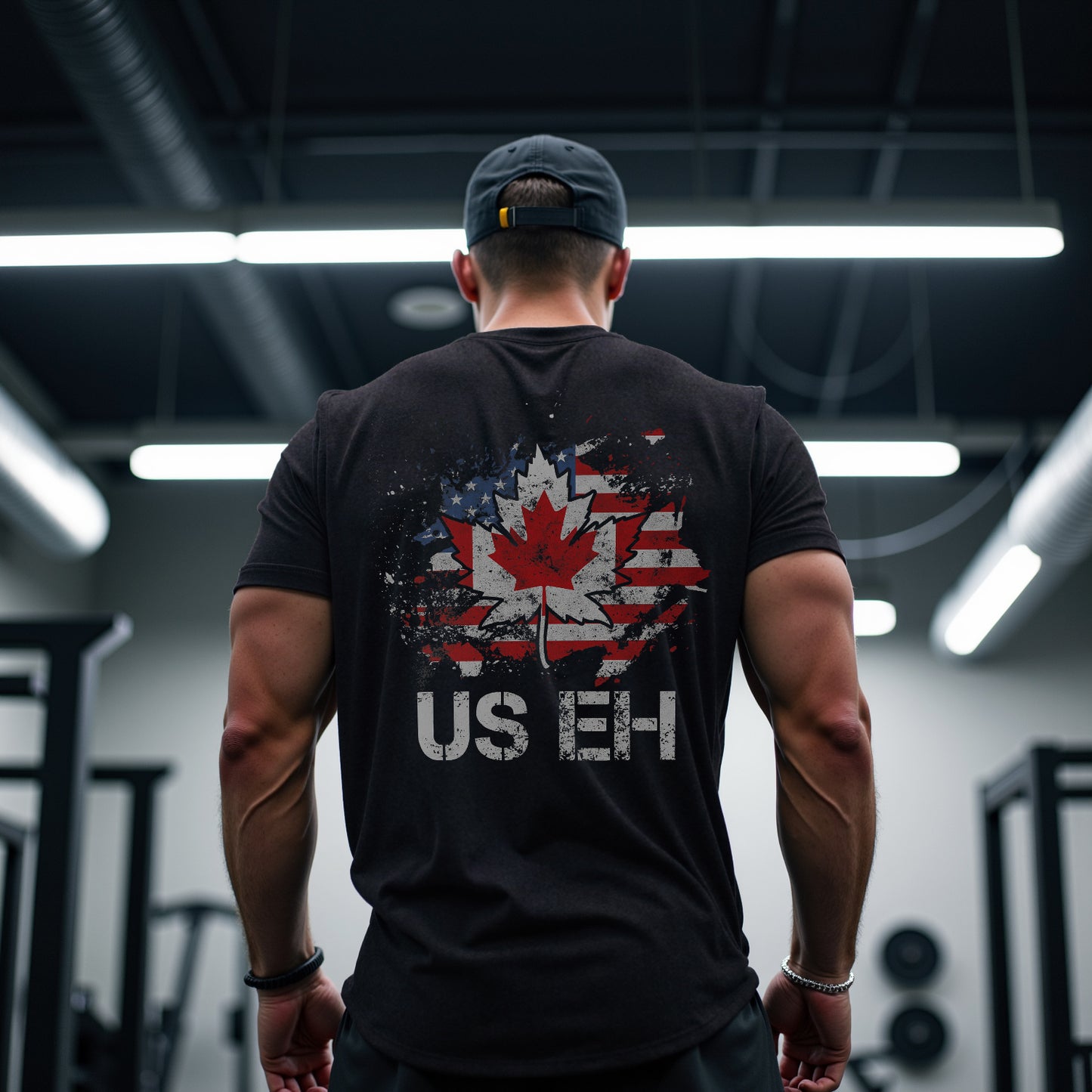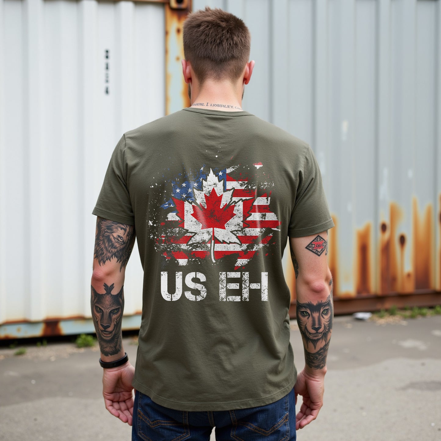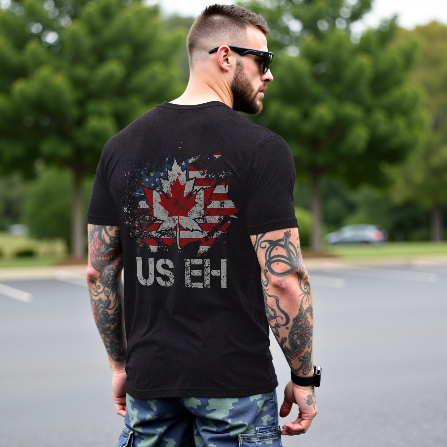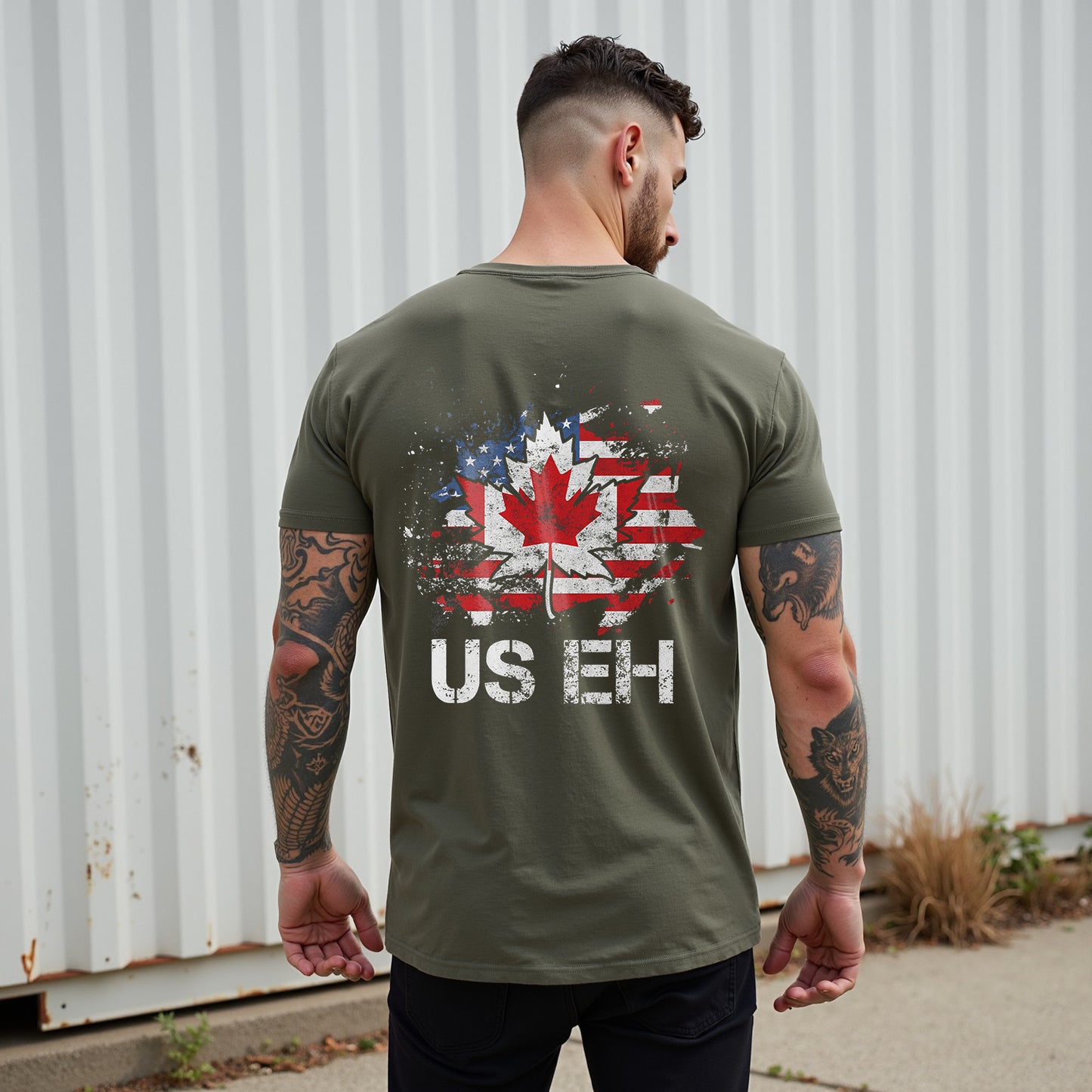 Celebrate North American friendship with LouMark’s US EH Maple Leaf Tee. This washed brown shirt features a distressed graphic combining the American and Canadian flags with a prominent red maple leaf, accompanied by the text “US EH.” Made from 100% cotton for comfortable wear with a vintage, rugged look.