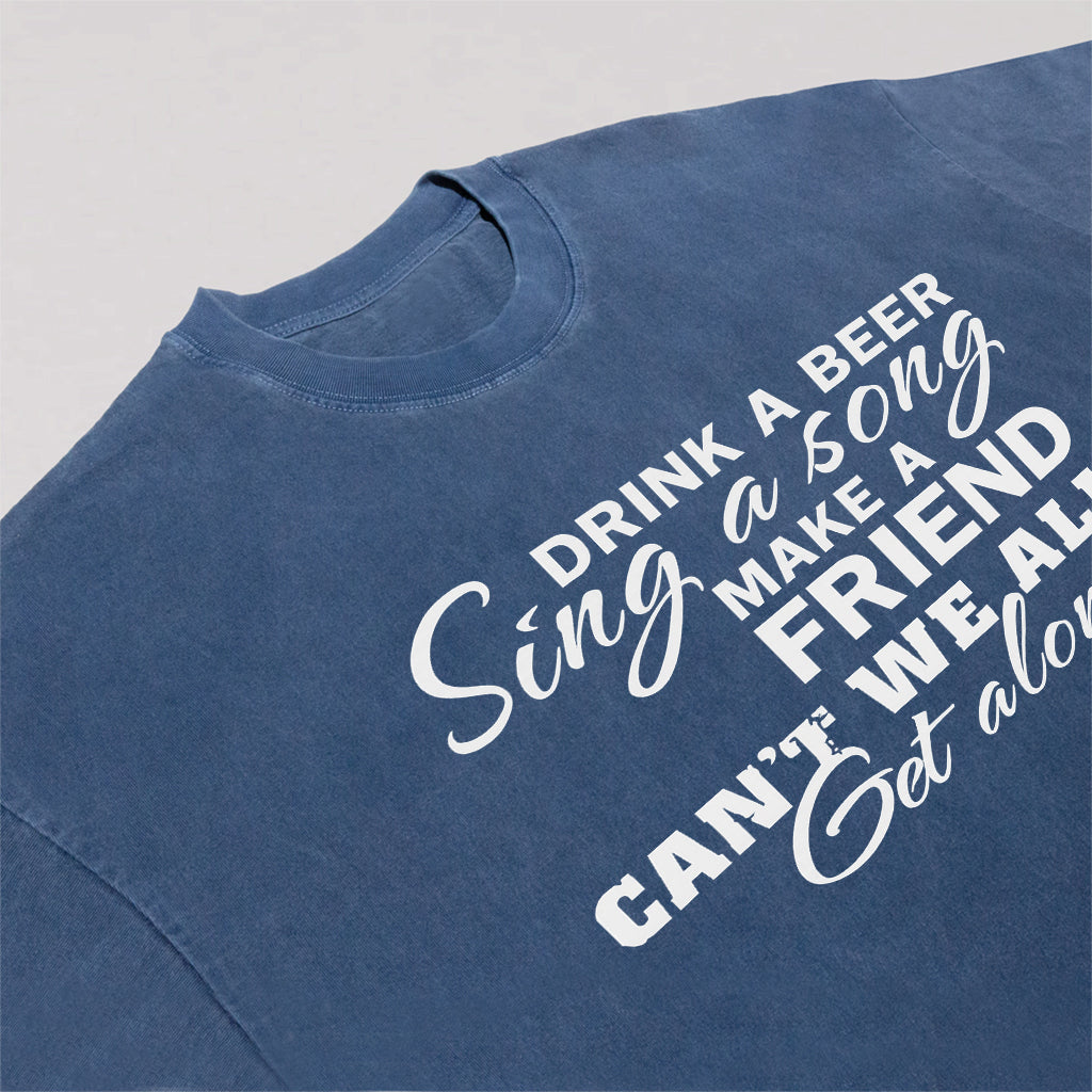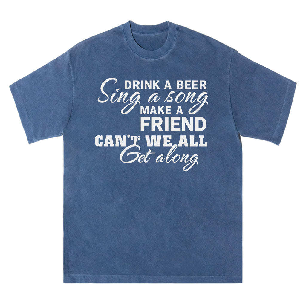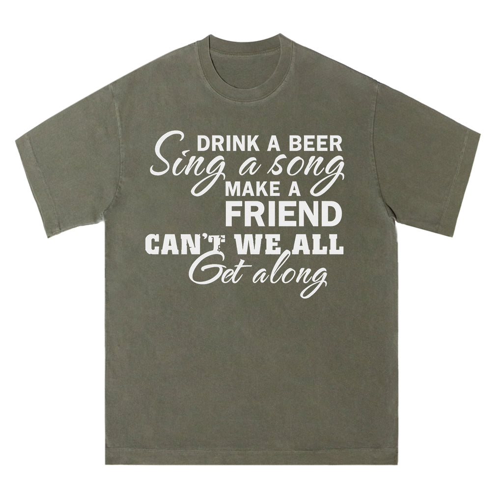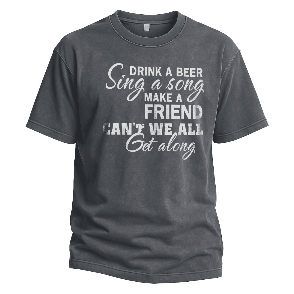 Celebrate good times and friendship with LouMark’s Drink a Beer Sing a Song Tee. This washed tan shirt features a vintage-style white typography graphic with the phrase “DRINK A BEER SING A SONG MAKE A FRIEND CAN’T WE ALL GET ALONG.” Made from 100% cotton for comfortable, casual wear with a warm, welcoming vibe.