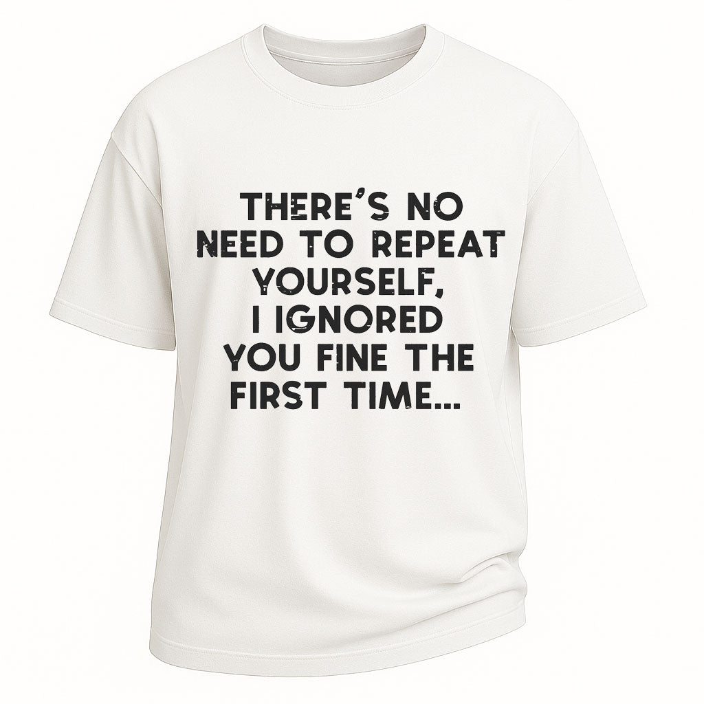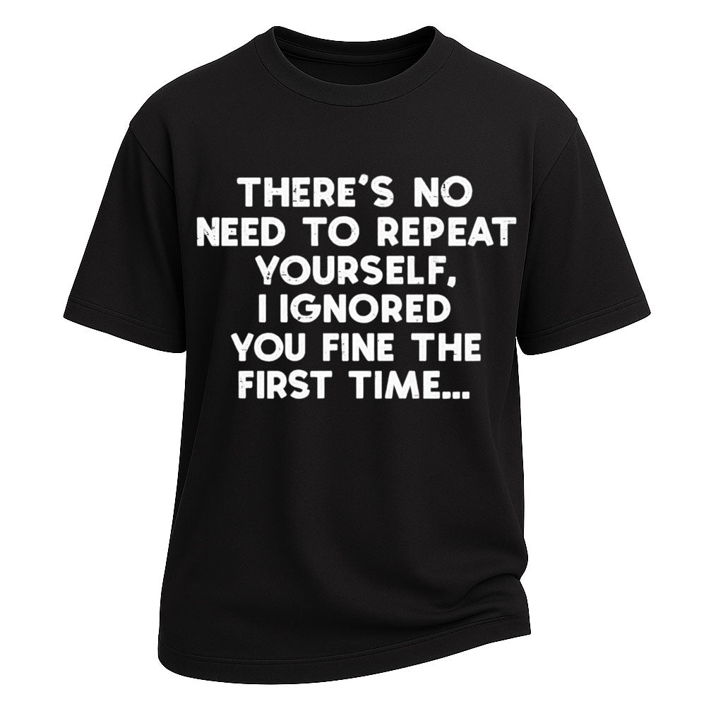 Verleihe deinem Style mit diesem Kurzarm-T-Shirt mit dem Aufdruck „Ignored You“ eine gehörige Portion Sarkasmus. Das schwere Shirt aus 100 % Baumwolle (260 g/m² ) garantiert langanhaltenden Tragekomfort und Strapazierfähigkeit. Der witzige Textaufdruck „THERE'S NO NEED TO REPEAT YOURSELF. I IGNORED YOU FINE THE FIRST TIME…“ setzt ein freches und humorvolles Statement. Dank der klassischen Passform und des Rundhalsausschnitts ist dieses Shirt ideal für Freizeit, Partys und Streetwear .