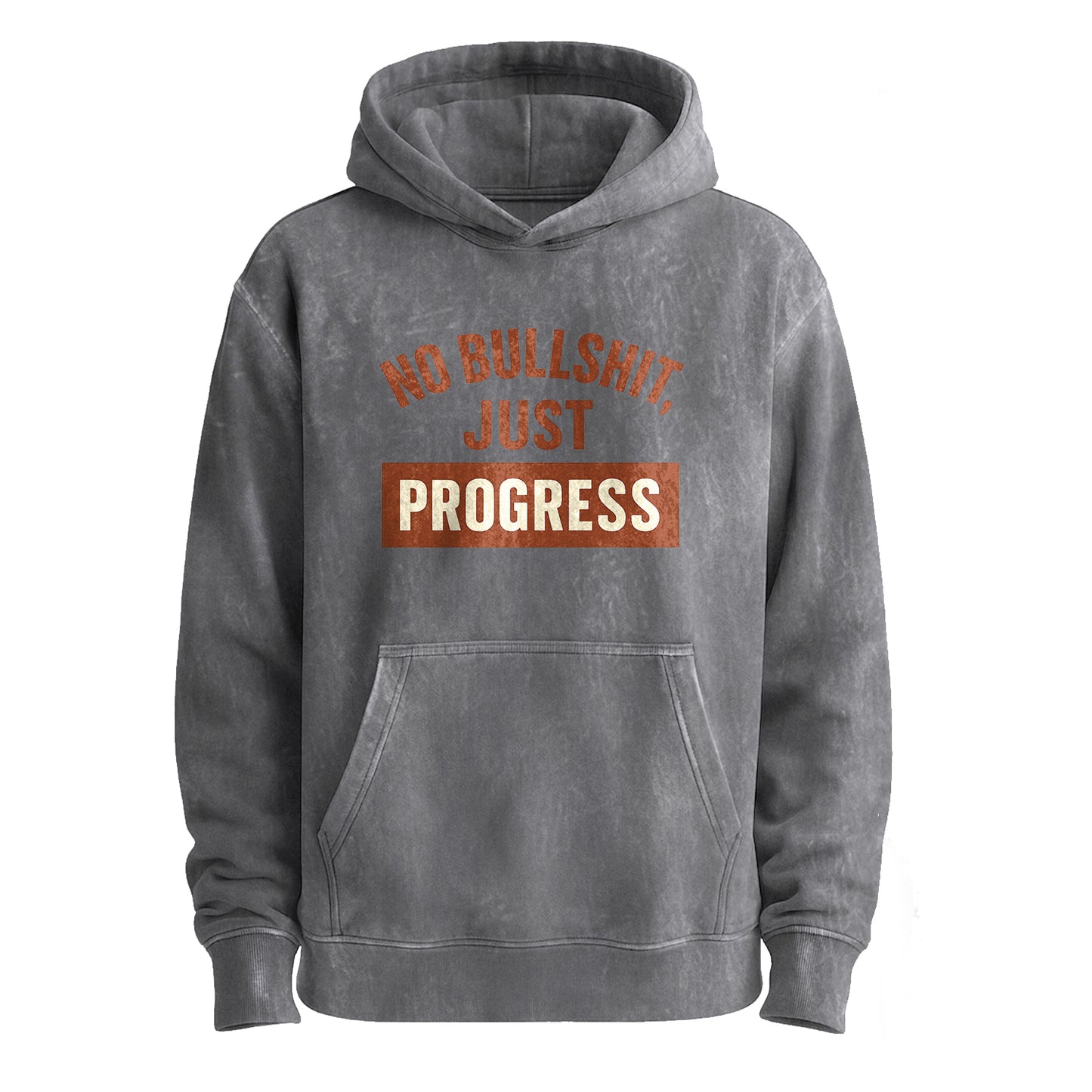 Dieser Vintage-Hoodie in Militärgrün besticht durch seine abgenutzte, rostfarbene Typografie in Bogenform mit dem Schriftzug „NO BULLSHIT, JUST“ und wird durch ein markantes, rostfarbenes Blockabzeichen mit der Aufschrift „PROGRESS“ in Creme abgerundet.