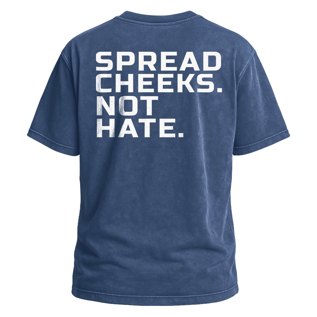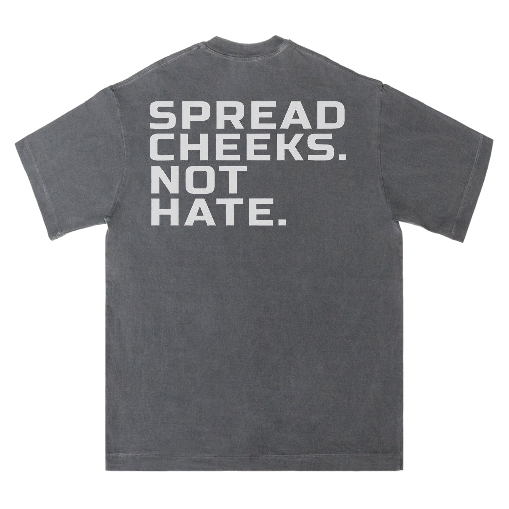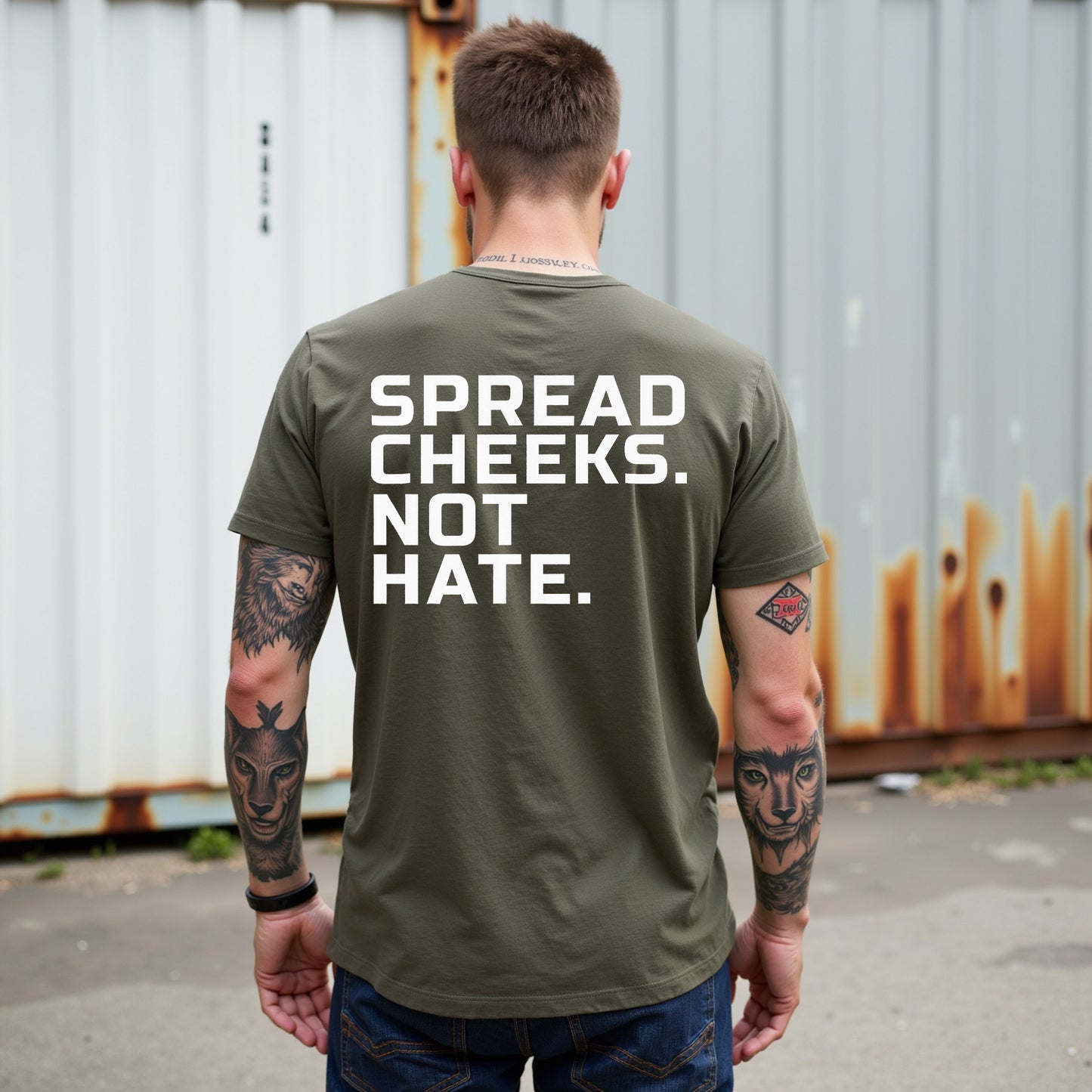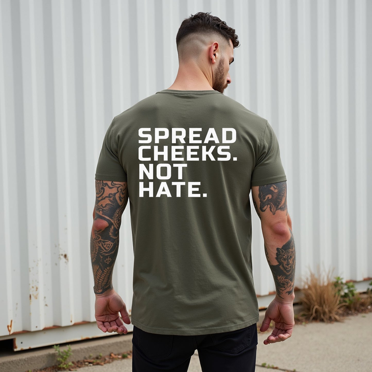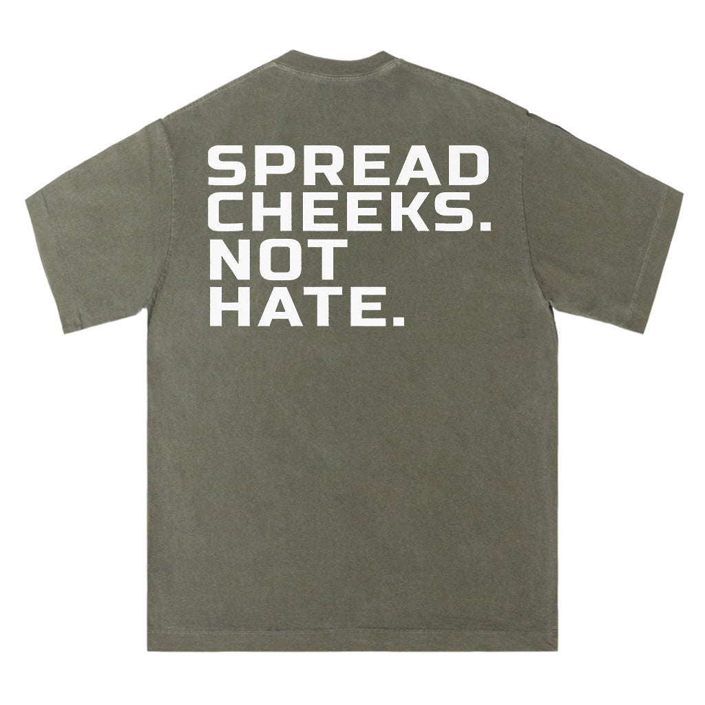 Setzen Sie ein mutiges und freches Statement mit LouMarks „Spread Cheeks Not Hate“-T-Shirt. Dieses verwaschene braune Shirt ziert auf der Rückseite eine große weiße Schrift mit der Aufschrift „SPREAD CHEEKS. NOT HATE.“ Hergestellt aus 100 % Baumwolle für bequeme Freizeitkleidung mit kompromissloser Haltung.
