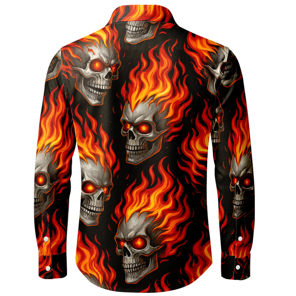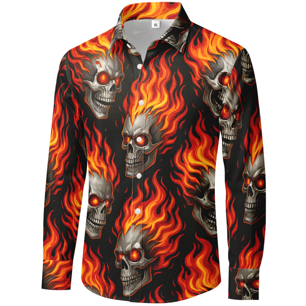 Dieses langärmlige Hemd mit Knopfleiste besticht durch ein feuriges Design mit flammenden Totenköpfen und lodernden Flammen auf tiefschwarzem Grund. Der randlose 3D-Sublimationsdruck sorgt für leuchtende Rot- und Orangetöne mit gestochen scharfen Details auf dem gesamten Hemd. Gefertigt aus glattem 100% Polyester, ist es leicht, knitterarm und schnelltrocknend – perfekt für Konzerte, Bike-Treffen, Festivals und als Statement-Streetwear.