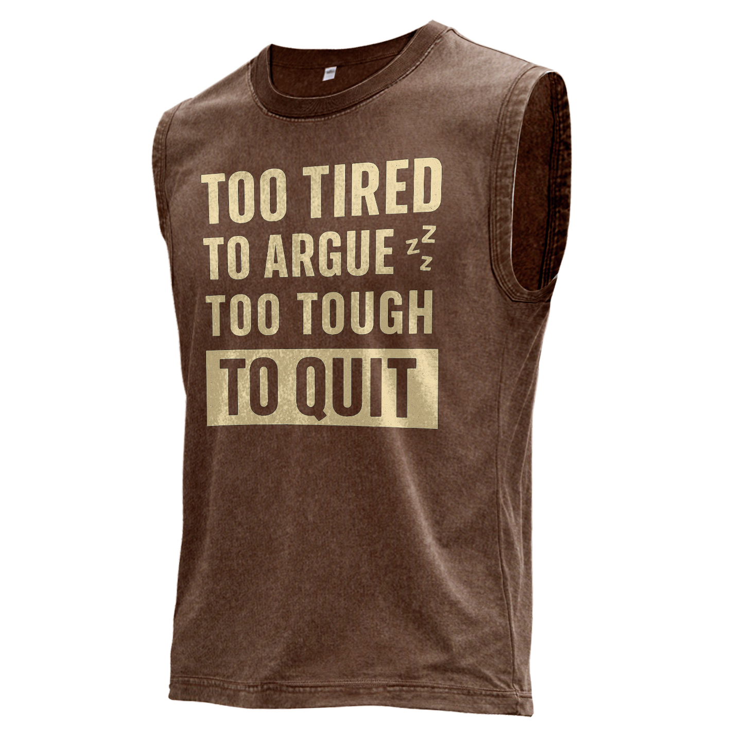 Dieses braune Vintage-Muskelshirt besticht durch übergroße, abgenutzte Schriftzüge in Knochenweiß/Elfenbein mit den Aufschriften „TOO TIRED / TO ARGUE“, akzentuiert durch winzige Zzz-Zeichen, und darunter ein markantes cremefarbenes Blockabzeichen mit der Aufschrift „TO QUIT“ unterhalb von „TOO TOUGH“.