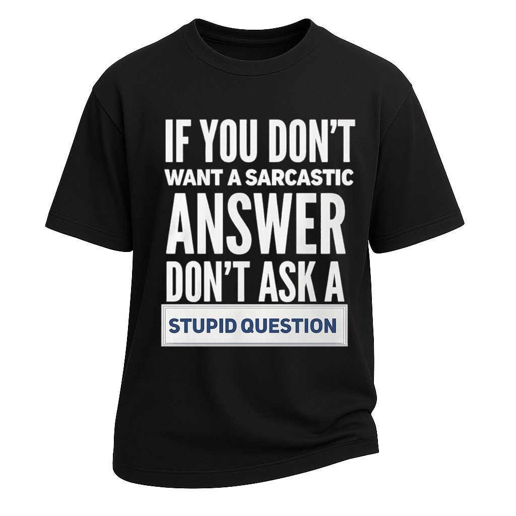 Dillo com'è con questa t-shirt con stampa audace: "Se non vuoi una risposta sarcastica, non fare una domanda stupida". La frase è stampata in bianco brillante e blu navy per un contrasto elevato e il massimo del sarcasmo. Realizzata in 100% cotone, con tessuto pesante da 260 g: comoda, resistente e costruita per durare.