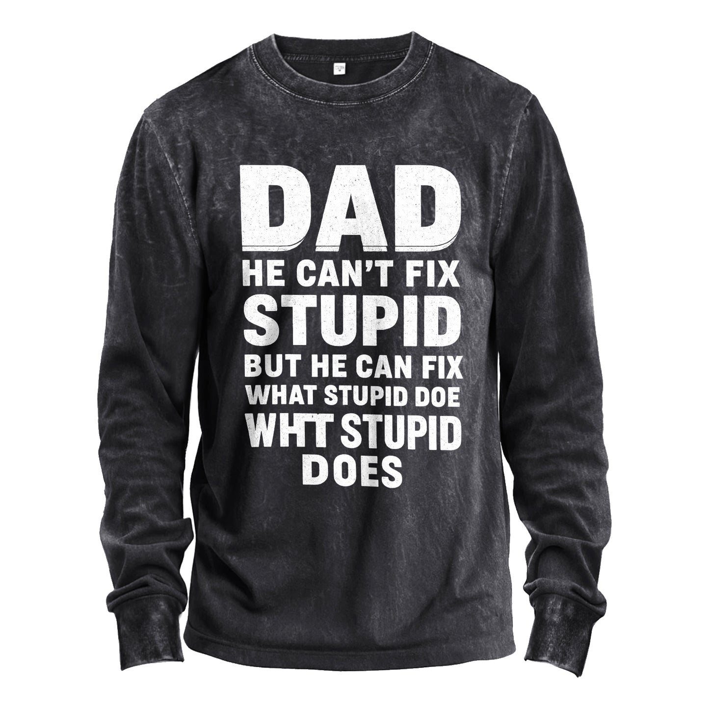 Per il papà pratico e con un pizzico di umorismo. Questa maglia a maniche lunghe con lavaggio vintage presenta una scritta in grassetto: "Papà non può riparare la stupidità, ma può riparare ciò che la stupidità fa". Realizzata in robusto cotone 100% da 230 g, è morbida, resistente e perfetta per i giorni di shopping e di riposo.