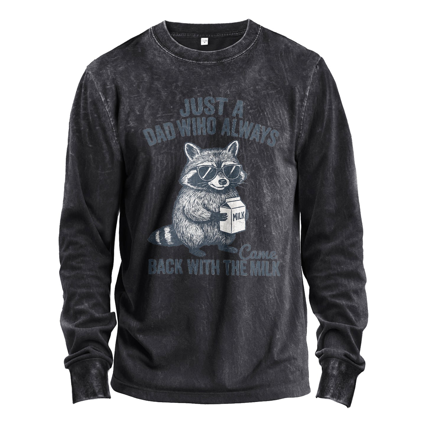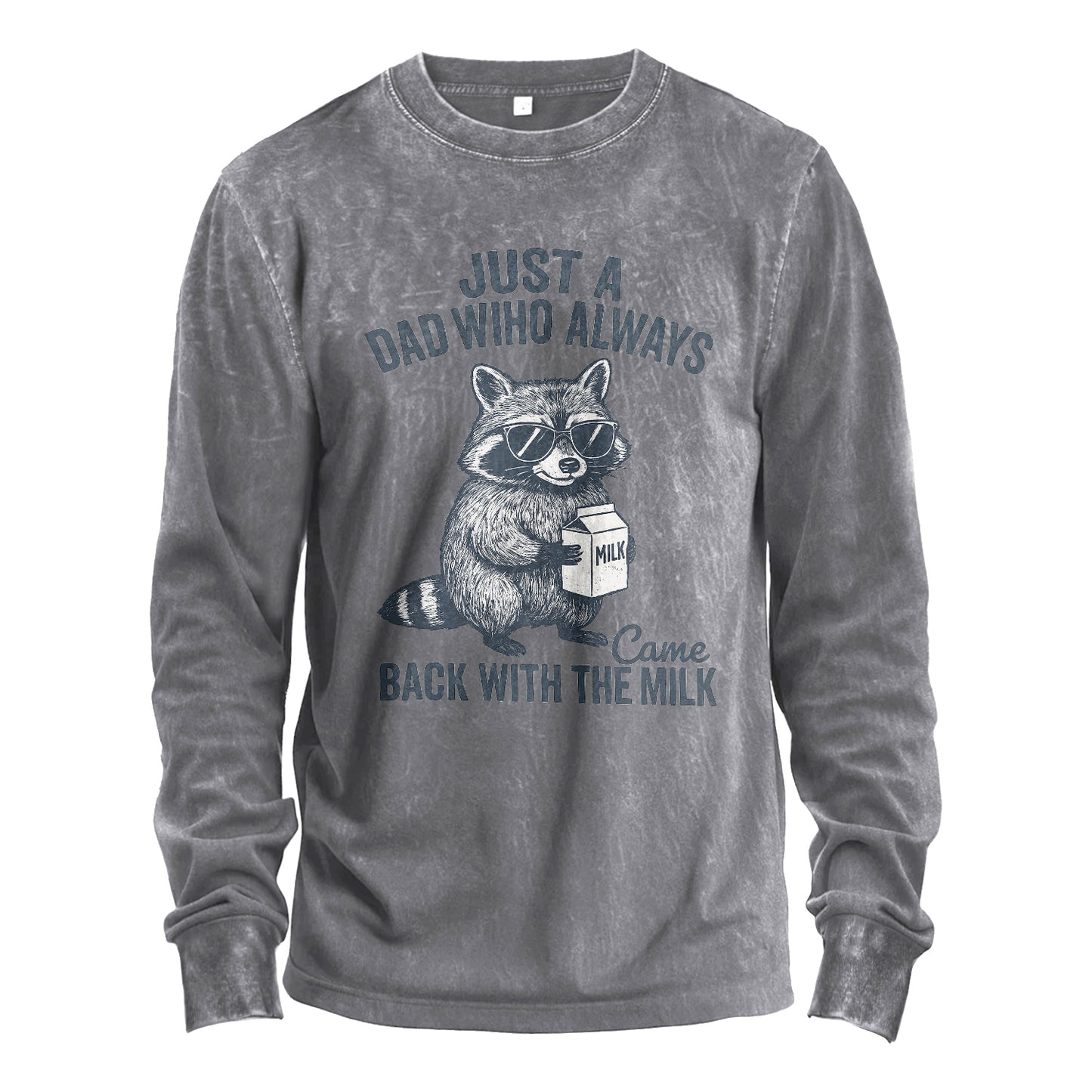 Celebra i papà che sono tornati davvero con il latte. Questa maglia a maniche lunghe lavata presenta un simpatico procione con occhiali da sole che tiene in mano un cartone del latte e la scritta "Just a Dad who always came back with the milk" (Solo un papà che tornava sempre con il latte). Realizzata in robusto cotone da 230 g e lavata in capo, per una sensazione di comfort fin dal primo giorno.