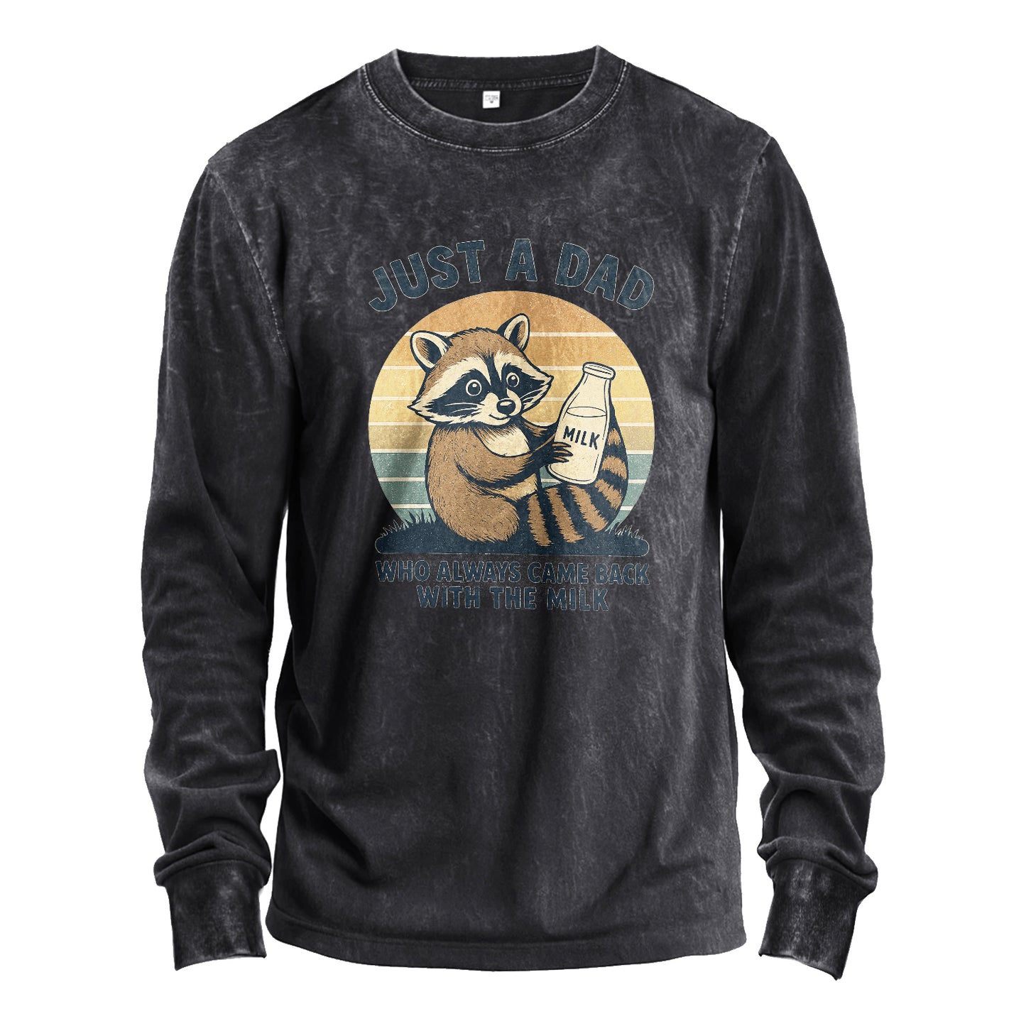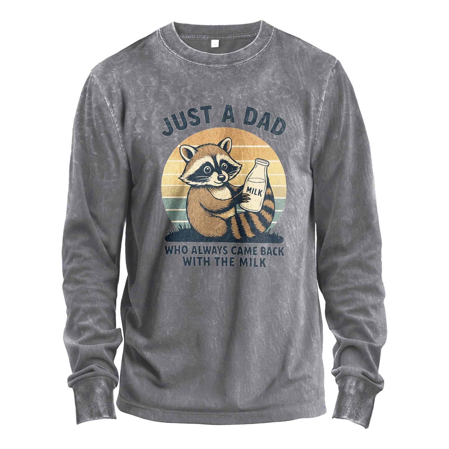Per i papà che sono tornati davvero con il latte. Questa maglia a maniche lunghe lavata presenta uno sfondo a cerchi retrò e un simpatico procione che stringe una bottiglia di latte. Realizzata in robusto cotone da 230 g e lavata in capo, offre quel comfort che si adatta perfettamente fin dal primo giorno.