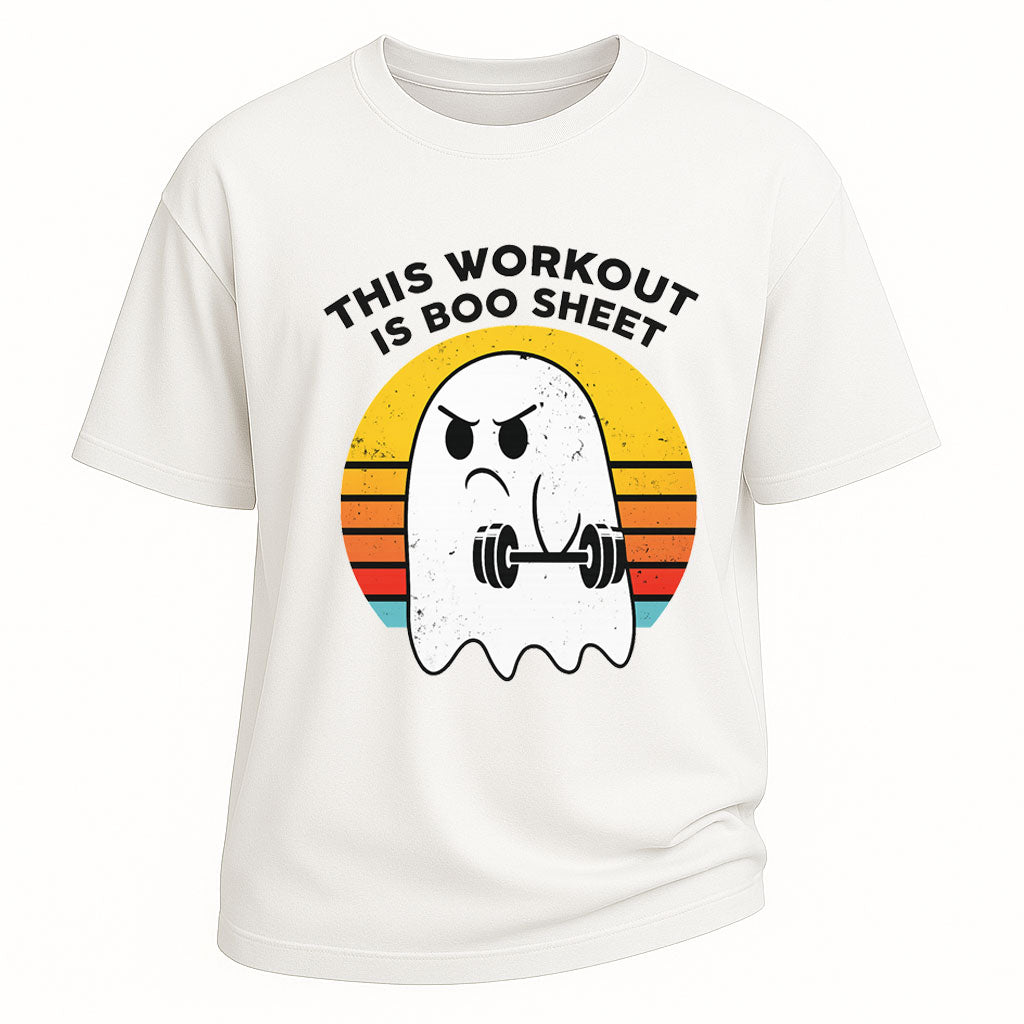 Solleva il morale e solleva i pesi con la maglietta "This Workout Is Boo Sheet" di LouMark, raffigurante un fantasma scontroso che solleva pesi su uno sfondo retrò con un tramonto. Perfetta per gli amanti del fitness con un inquietante senso dell'umorismo.