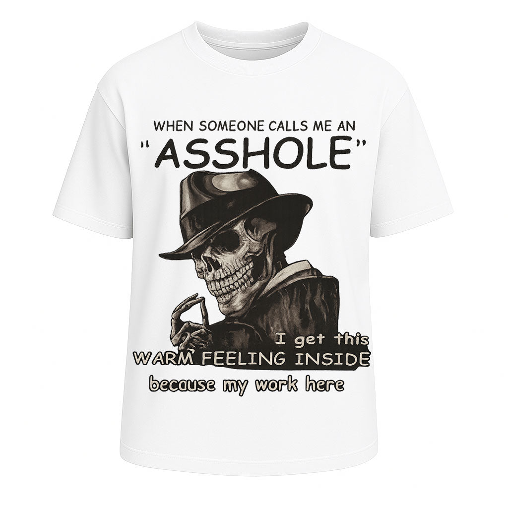 "Quando qualcuno mi chiama 'stronzo', provo una sensazione di calore dentro perché il mio lavoro qui è finito." Questa audace stampa sarcastica in bianco osso e marrone trasmette energia da battuta con uno scheletro in un cappello fedora, emanando le classiche vibrazioni da gangster che incontrano l'umorismo nero. Stampata su tessuto pesante 100% cotone da 260 g, è pensata per essere comoda e di carattere.