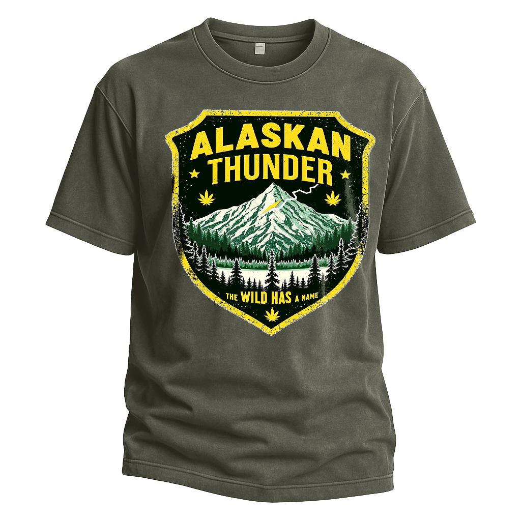 Robusta, audace e sfacciatamente selvaggia: questa maglietta Alaskan Thunder non sussurra, ruggisce. Con una vivace grafica in stile patch raffigurante le cime frastagliate dell'Alaska, le fitte foreste di pini e i cieli carichi di fulmini, dichiara una cosa forte e chiara: "La natura selvaggia ha un nome". Decorata con delicate foglie di cannabis, questa maglietta incarna la potenza della natura con un tocco di ribellione.