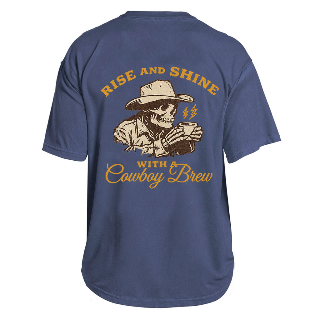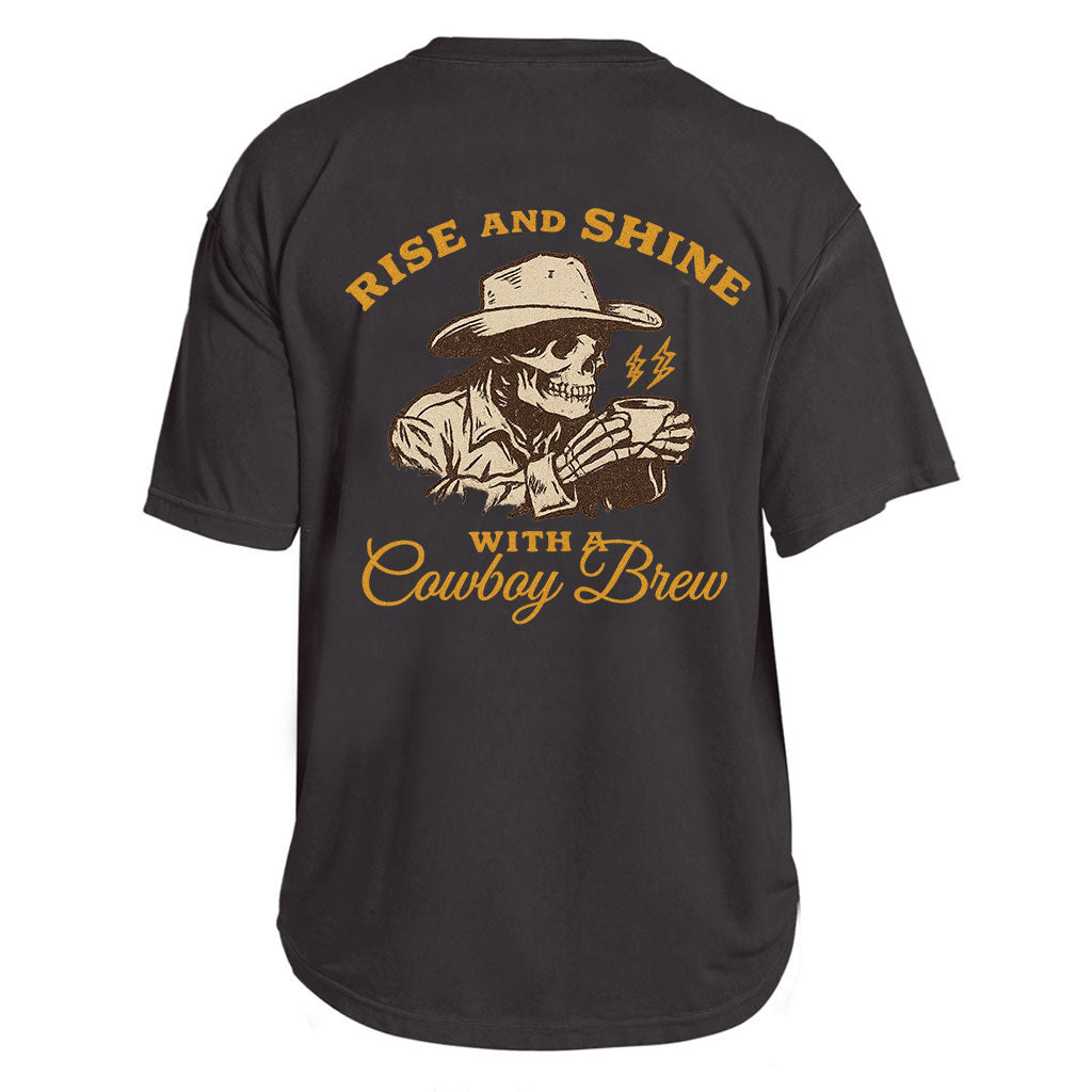 Esprimete il vostro robusto spirito western con la maglietta grafica LouMark "Cowboy Brew". Caratterizzata da un'audace stampa sul retro di un cowboy scheletro che sorseggia il suo caffè mattutino, abbinata allo slogan "Rise and Shine with a Cowboy Brew", questa maglietta fonde umorismo e grinta americana. La parte anteriore è elegantemente decorata con il logo LouMark a forma di longhorn, mantenendo il vostro look autentico e in linea con il marchio. Realizzata per chi guida duro e beve lentamente, è un omaggio ai mattinieri dall'animo selvaggio. Il cotone morbido e traspirante garantisce comfort per tutto il giorno, che siate al ranch, in strada o nel vostro ristorante preferito. Montate in sella con stile.