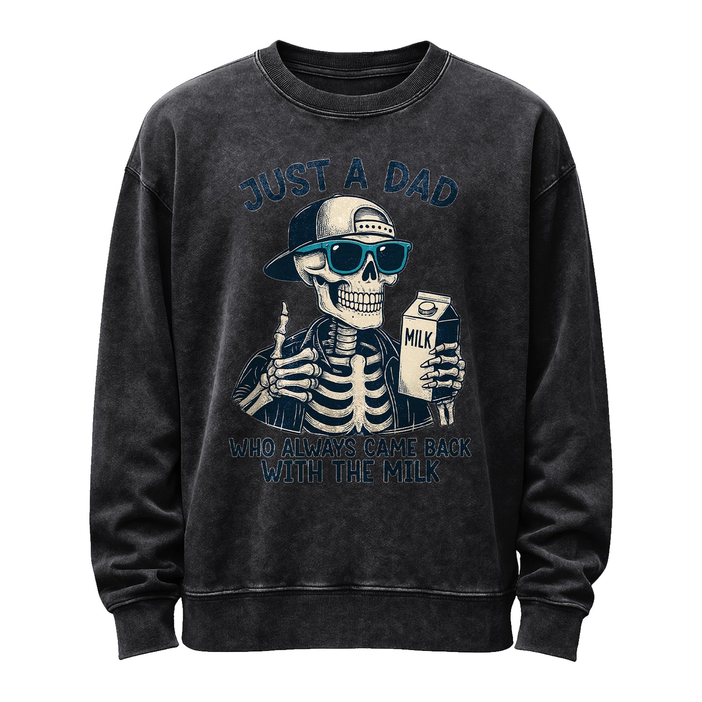 Per i papà che consegnano i loro prodotti, latte incluso. Questa felpa nera vintage presenta un simpatico papà scheletro con occhiali da sole e un berretto che tiene in mano un cartone del latte, con la scritta "JUST A DAD" e la didascalia "WHHO ALWAYS CAME BACK WITH THE MILK". Realizzata in robusto pile da 350 g (80% cotone / 20% poliestere) per una sensazione di morbidezza e comfort fin da subito.