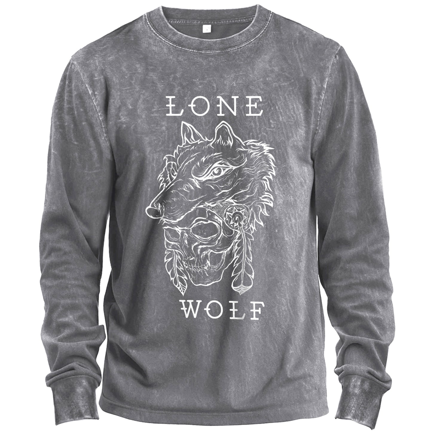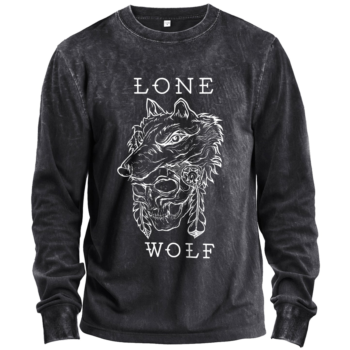 Segui la tua strada. Questa t-shirt a maniche lunghe verde militare con effetto vintage wash presenta una grafica bianca e pulita raffigurante una testa di lupo su un teschio con dettagli di piume, incorniciata dalla scritta "LONE WOLF". Realizzata in morbido cotone al 100%, è perfetta da indossare fin da subito.