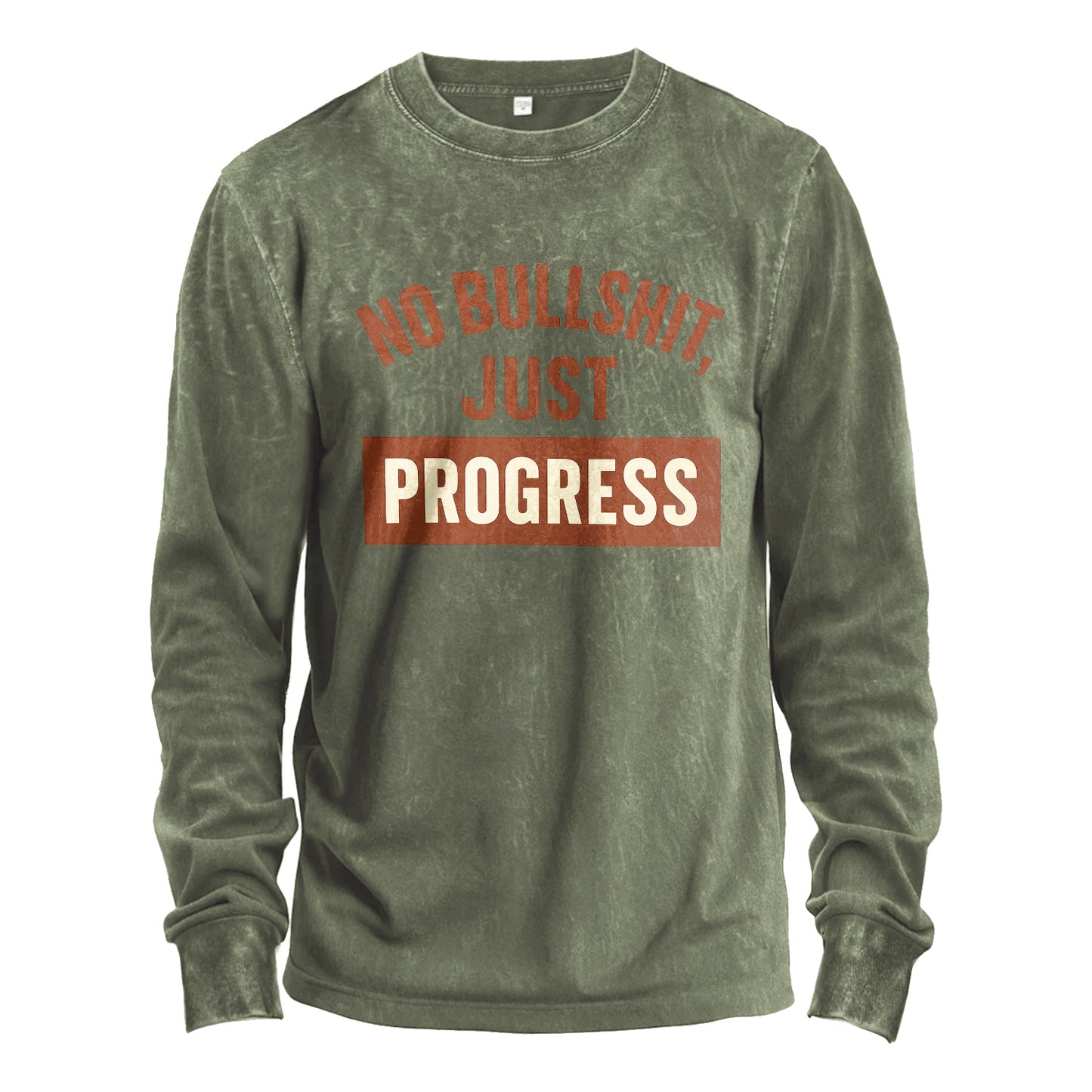 Corpo in oliva militare vintage-washed con tipografia ruggine anticata ad arco "NO BULLSHIT, JUST", rifinito con un vistoso stemma color ruggine con la scritta "PROGRESS" in crema.
