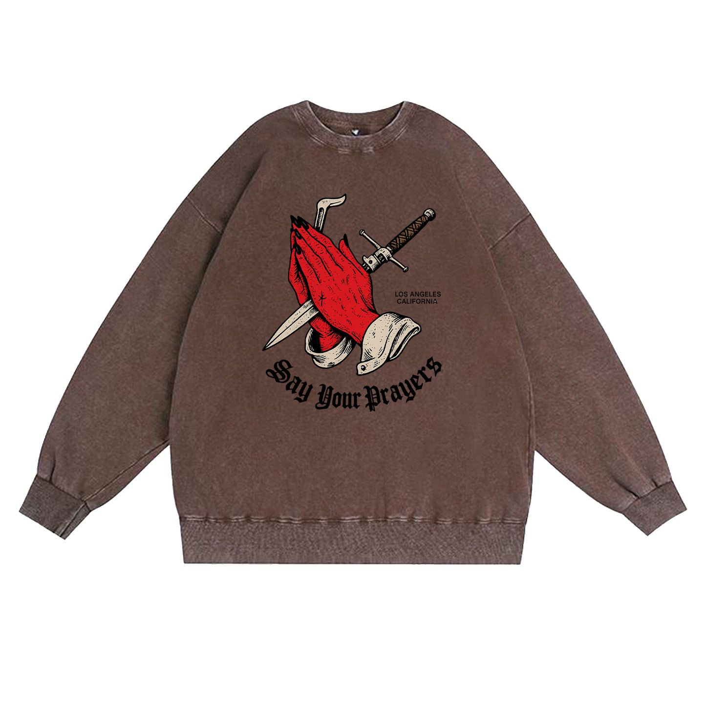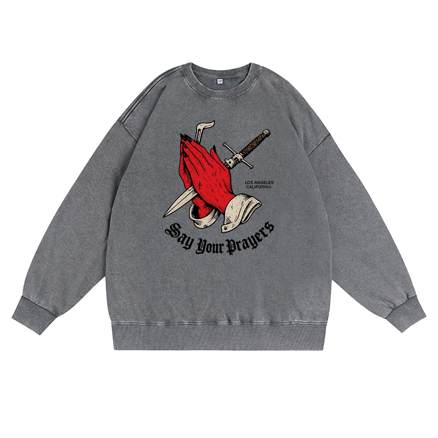 Grintosa, reverente e un po' pericolosa. Questa felpa grigio cenere con effetto vintage presenta delle suggestive mani in preghiera rosse sovrapposte a un pugnale e una spada, rifinite con la scritta gotica "Say Your Prayers" e un discreto dettaglio "Los Angeles, California". Realizzata in robusto pile da 350 g (80% cotone / 20% poliestere) per una sensazione di morbidezza e comfort fin dal primo utilizzo.