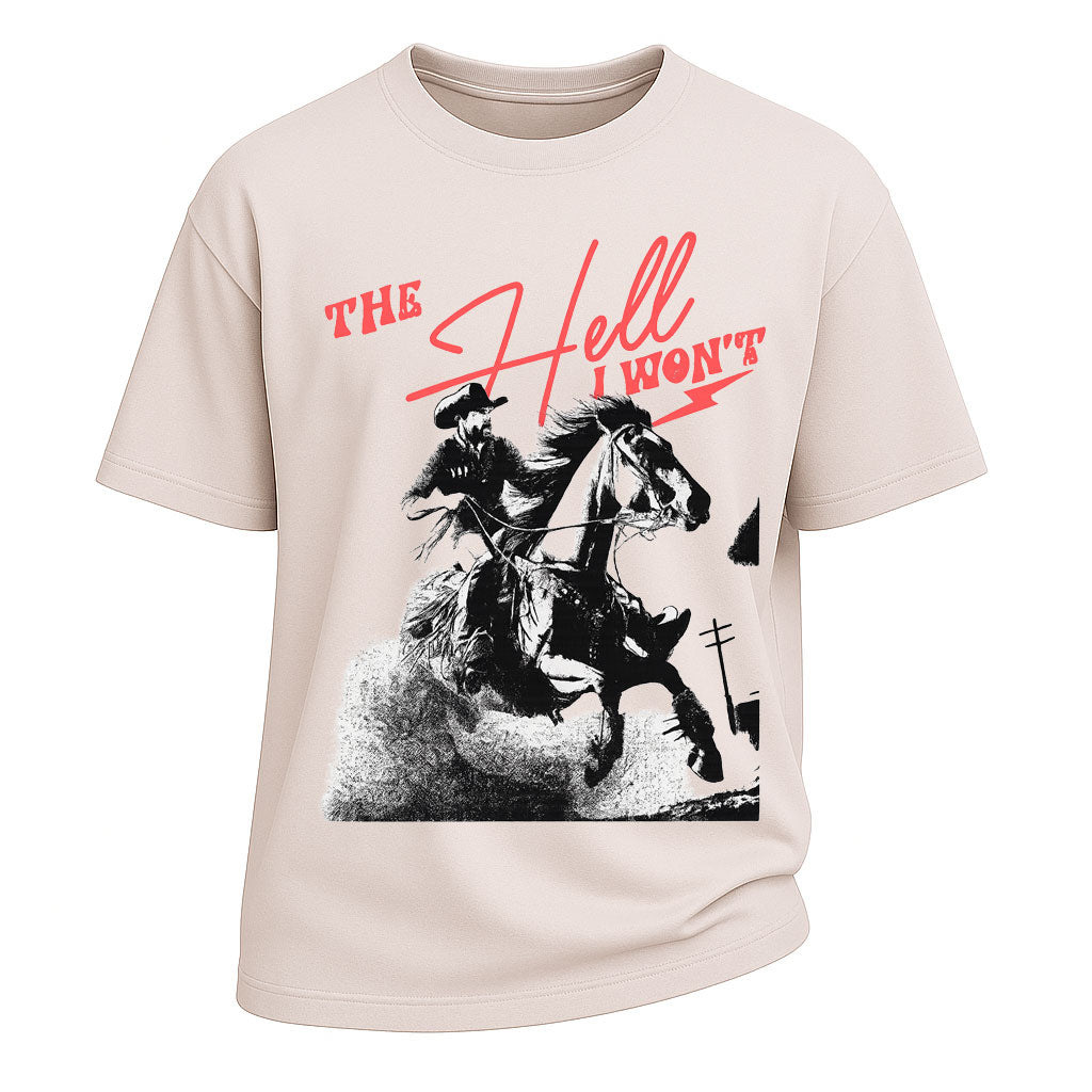 Incarna l'intrepido spirito cowboy con la t-shirt LouMark "The Hell I Won't". Con un'audace grafica da rodeo rider e una sorprendente tipografia western, questa maglietta è pensata per i ribelli che non si arrendono mai. Realizzata in 100% cotone pesante da 260 g, offre resistenza, comfort e una silhouette oversize e robusta, perfetta per lo stile di vita western.
