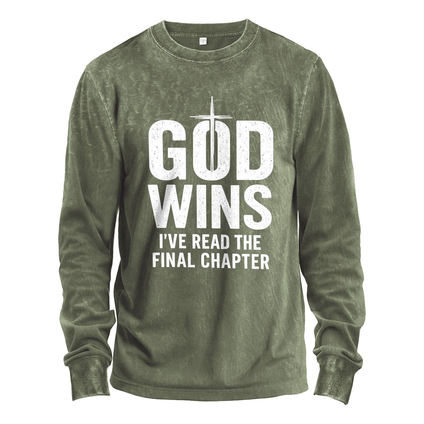Glaubensbejahend und langlebig. Dieses langärmlige Shirt in Vintage-Optik mit olivgrüner Waschung trägt die Aufschrift „GOTT SIEGT – Ich habe das letzte Kapitel gelesen“ und ist mit einem dezenten Kreuzmotiv verziert. Gefertigt aus robustem 230 g/m²-Baumwollstoff (100 %) für ein weiches, angenehmes Tragegefühl vom ersten Moment an.