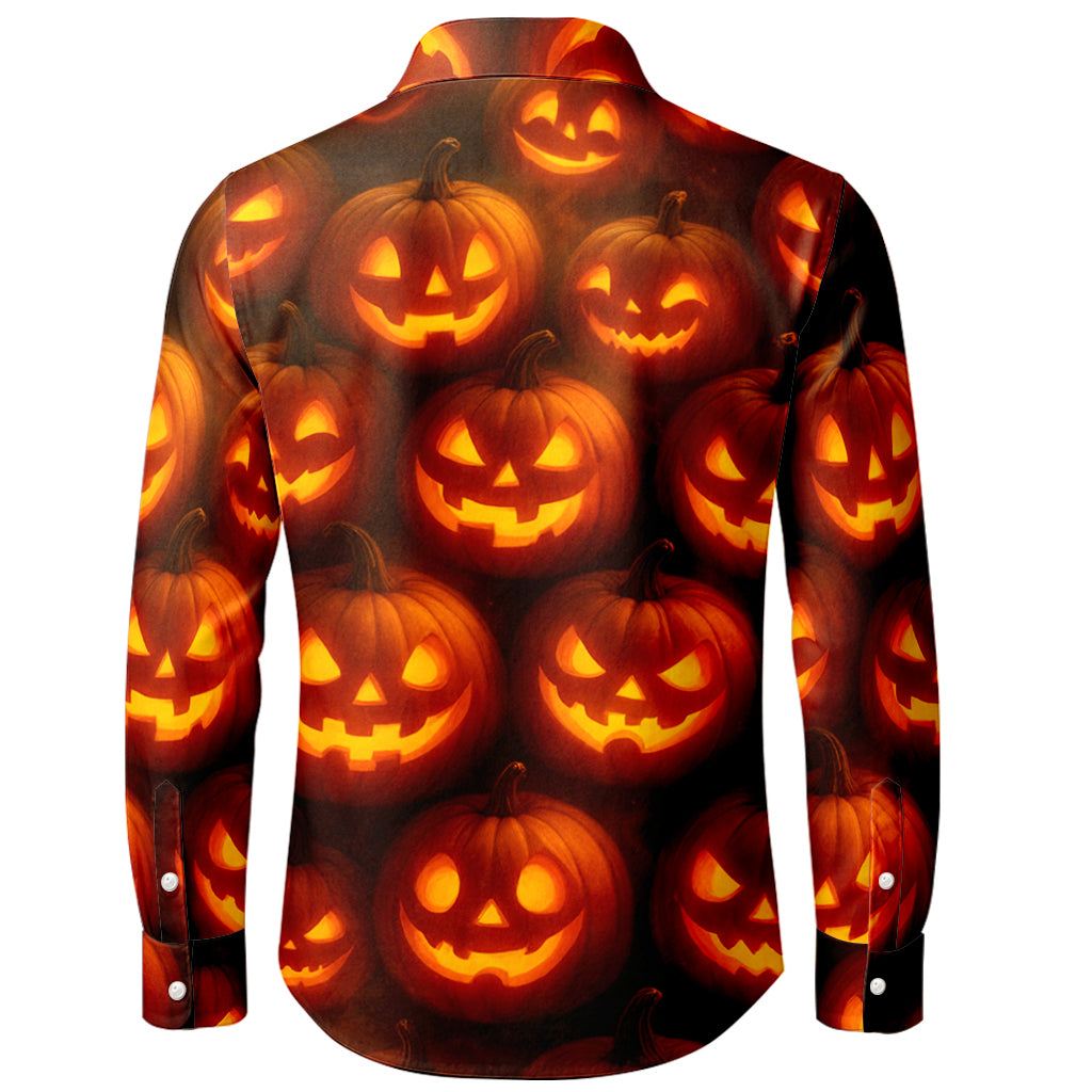 Nur Süßes, keine Streiche. Dieses langärmlige Hemd ist von Rand zu Rand mit leuchtenden Kürbisgesichtern bedruckt, die einen warmen, kerzenlichtähnlichen Schimmer auf tiefschwarzem Hintergrund erzeugen. Der 3D-Sublimationsdruck besticht durch leuchtende Orangetöne und sanfte, rauchige Farbverläufe mit gestochen scharfen Details vom Kragen bis zum Saum. Hergestellt aus glattem 100% Polyester, ist es leicht, knitterarm und schnelltrocknend – perfekt für Halloween-Partys, Kürbisfeste und festliche Streetwear.
