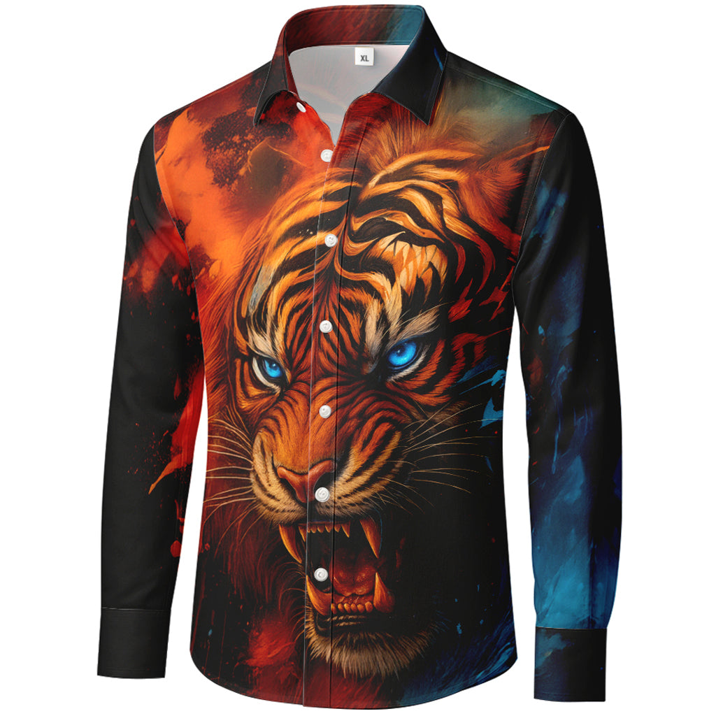 Heiß trifft kalt. Dieses langärmlige Hemd mit Knopfleiste zeigt einen wilden Tiger mit stechend blauen Augen, dessen eine Seite in leuchtendes Rot und die andere in eisiges Blau unterteilt ist. Der randlose 3D-Sublimationsdruck sorgt für explosive Farben und gestochen scharfe Details vom Kragen bis zum Saum. Gefertigt aus glattem 100% Polyester, ist es leicht, knitterarm und schnelltrocknend – perfekt für Konzerte, Festivals, Partys und als Statement-Streetwear.
