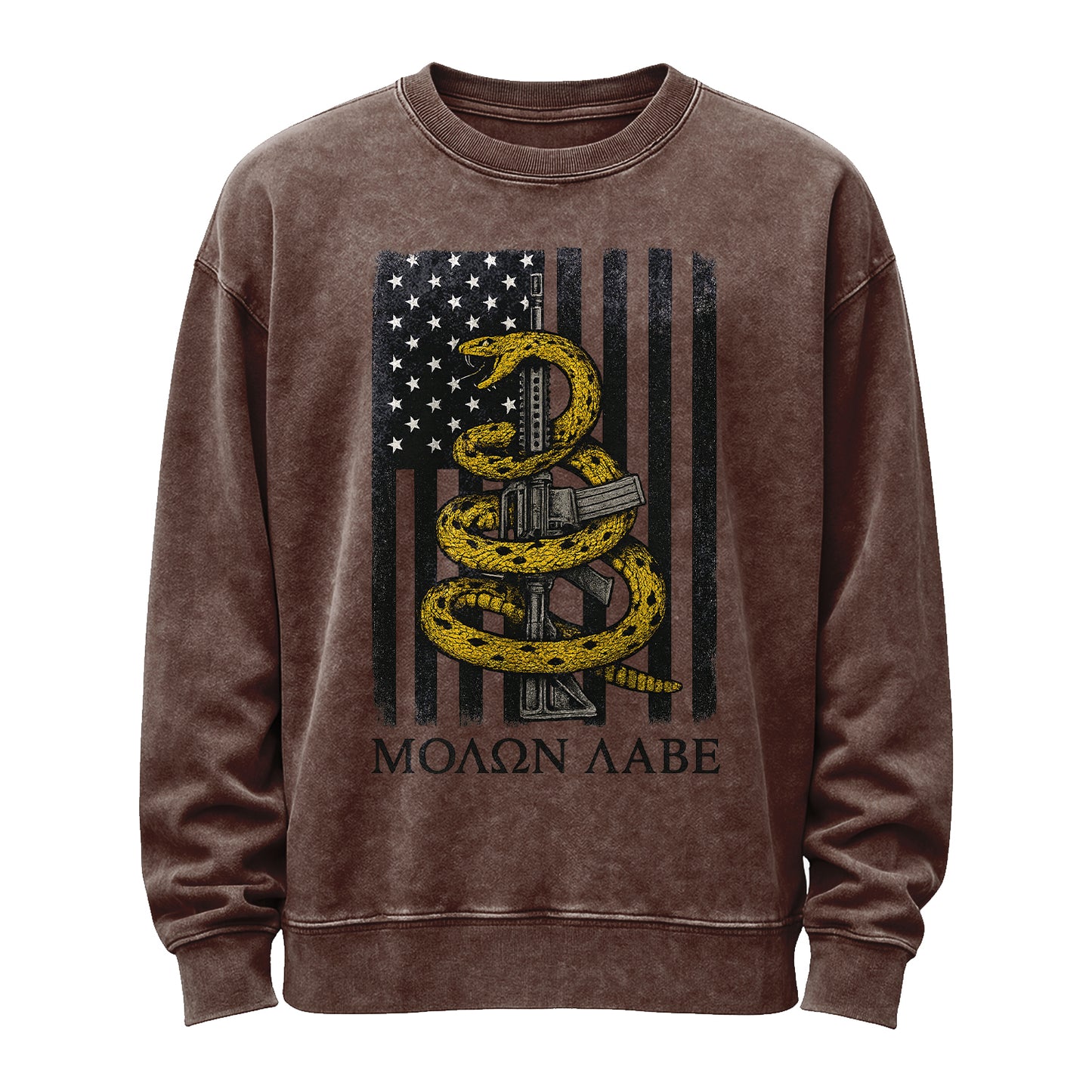 Markant und kampferprobt. Dieses Sweatshirt in Vintage-Waschung und Armeegrün zeigt eine verwaschene, grau getönte amerikanische Flagge mit einer um ein Gewehr gewundenen gelben Klapperschlange und dem griechischen Schriftzug „ΜΟΛΩΝ ΛΑΒΕ“. Gefertigt aus robustem 350-g-Fleece (80 % Baumwolle / 20 % Polyester) für ein weiches, angenehmes Tragegefühl direkt nach dem Auspacken.